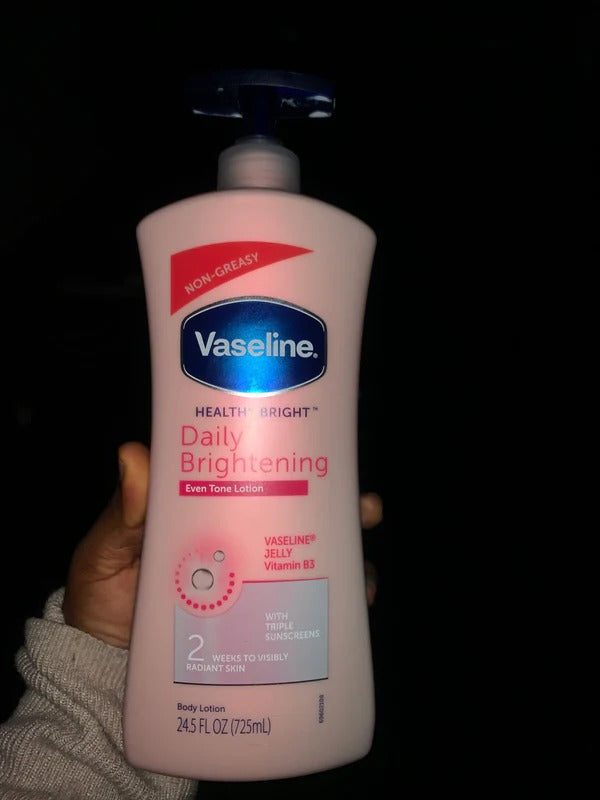 Description: Vaseline Healthy Bright Daily Brightening Even Tone Lotion is a revitalizing body lotion designed to nourish and brighten the skin, giving you an even and radiant complexion every day. Formulated with a blend of microdroplets of Vaseline Jelly and a Vitamin B3 complex, this lotion works deep within the skin to even out skin tone and reduce dark spots, leaving your skin with a healthy, radiant glow. It provides long-lasting hydration, smooths rough skin, and enhances the skin's natural brightness, ensuring it looks luminous and healthy. Ideal for daily use, this lightweight, non-greasy lotion absorbs quickly, leaving skin feeling soft, smooth, and beautifully even-toned.